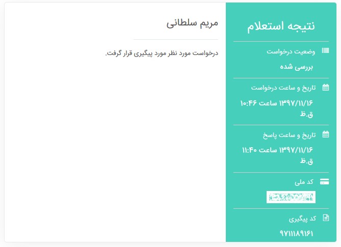 - در آخر گزینه "پیگیری درخواست" را انتخاب تا نتیجه درخواست خود را مشاهده نمایید.