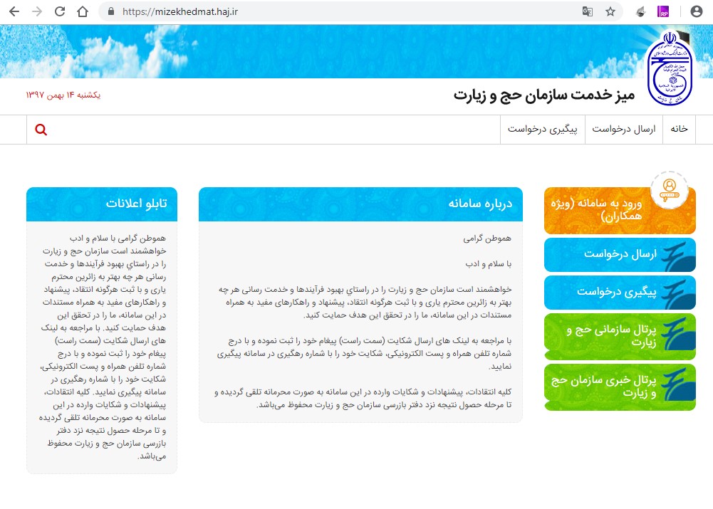 (نمایی از صفحه خانه میز خدمت سازمان حج و زیارت)