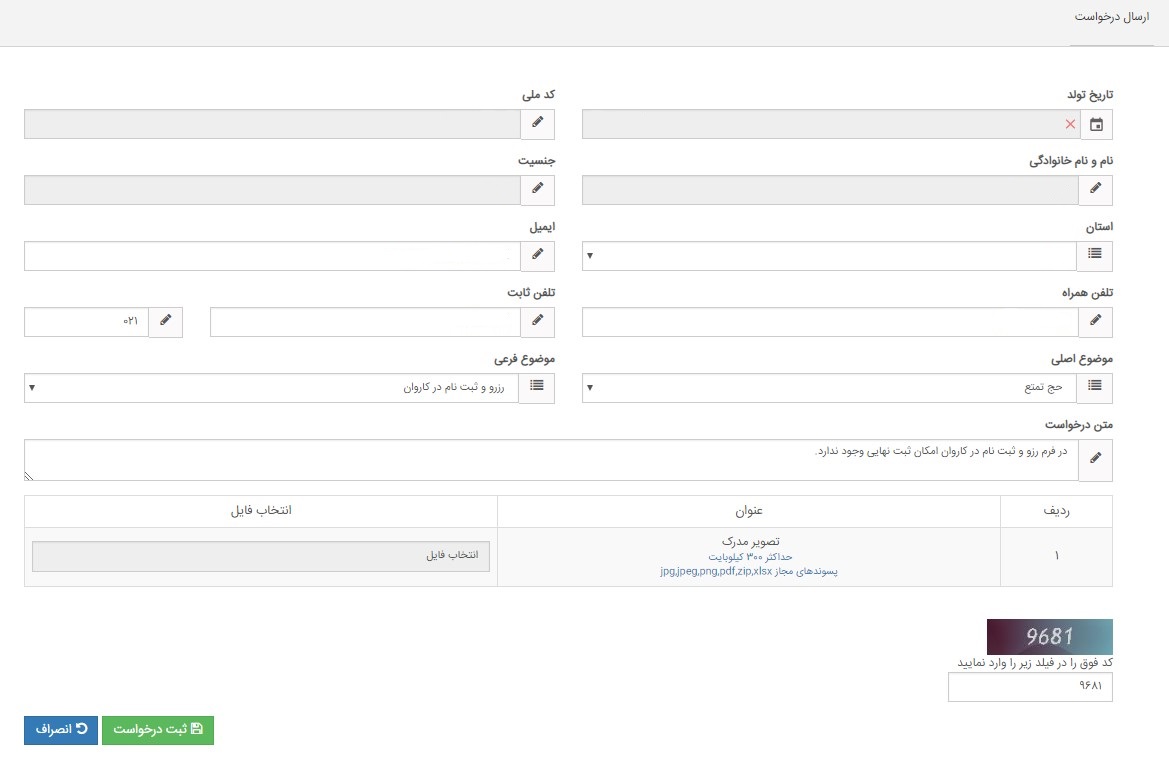 در صفحه خانه سامانه میز خدمت حج و زیارت گزینه "ارسال درخواست" را انتخاب نمایید. صفحه ارسال درخواست برای شما نمایش داده میشود که شامل اطلاعات زیر میباشد: