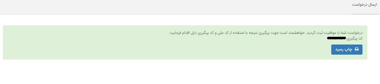 (نمایی از پیغام ارسال موفق درخواست و کد پیگیری)